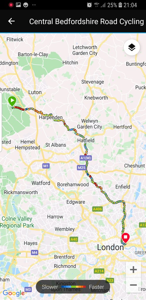 So after saying bye to my parents it was a late-ish start at 1030am, the first few miles where a reverse of yesterday including a killer(not able to pedal up) hill. Then after that just gently undulating through some lovely quite lanes and some busier roads until Hatfield where a rather good cafe produced a satay chicken wrap and coffee. Then it was down past south mimms service station and a successful traverse of the M25. This particular traverse I failed on last year as the rain had put the stream in flood…..and I had to instead cycle around the rather large A1 and M25 junction roundabout….which was er intresting!!. Diving under much better, but the path could be SO much better.